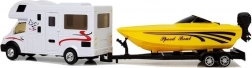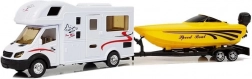 Tento stylový karavan s žlutým motorovým člunem je ideální pro malé řidiče a milovníky vody. Díky setrvačníkovému pohonu stačí vůz jemně natáhnout dozadu a pustit – vozidlo samo sviští vpřed. Realistické detaily jako sedadla a volant podněcují představivost a rozvíjejí vyprávění příběhů.
