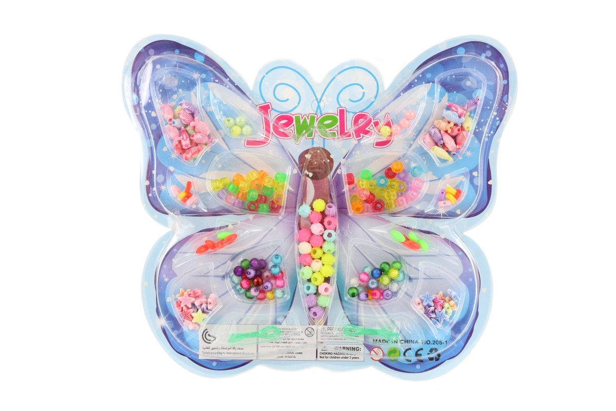 Tato kreativní sada barevných plastových korálků nabízí zábavu pro malé i velké tvůrce. V balení najdete korálky různých tvarů a velikostí a dvě šňůrky k navlékání – ideální pro výrobu originálních náramků a náhrdelníků. Balení ve tvaru motýlka je praktické a lákavé pro děti od 3 let. Různé tvary a barvy, 2 šňůrky v balení, rozvoj jemné motoriky a kreativity.