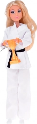 Bílé kimono s černým páskem a zlatá trofej pro vítězku. Panenka s kloubovými pažemi zvládne i bojové pózy a oslavu úspěchu.