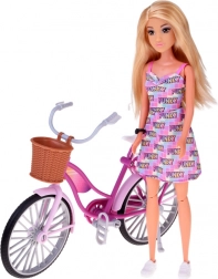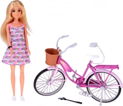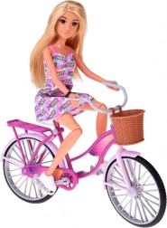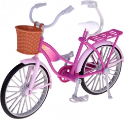 Růžovo‑fialové kolo s předním košíkem, zadním nosičem, pedály a loukoťovými koly se volně kutálí a snadno se ovládá. Sedlo s držákem udrží panenku stabilně během „jízdy“.