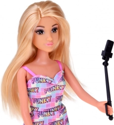 Panenka má artikulovaná kolena a lokty, díky čemuž snadno pózuje při jízdě, focení i dalších scénkách. Moderní šaty FUNKY a bílé tenisky doplňuje stylový doplněk – chytré hodinky.