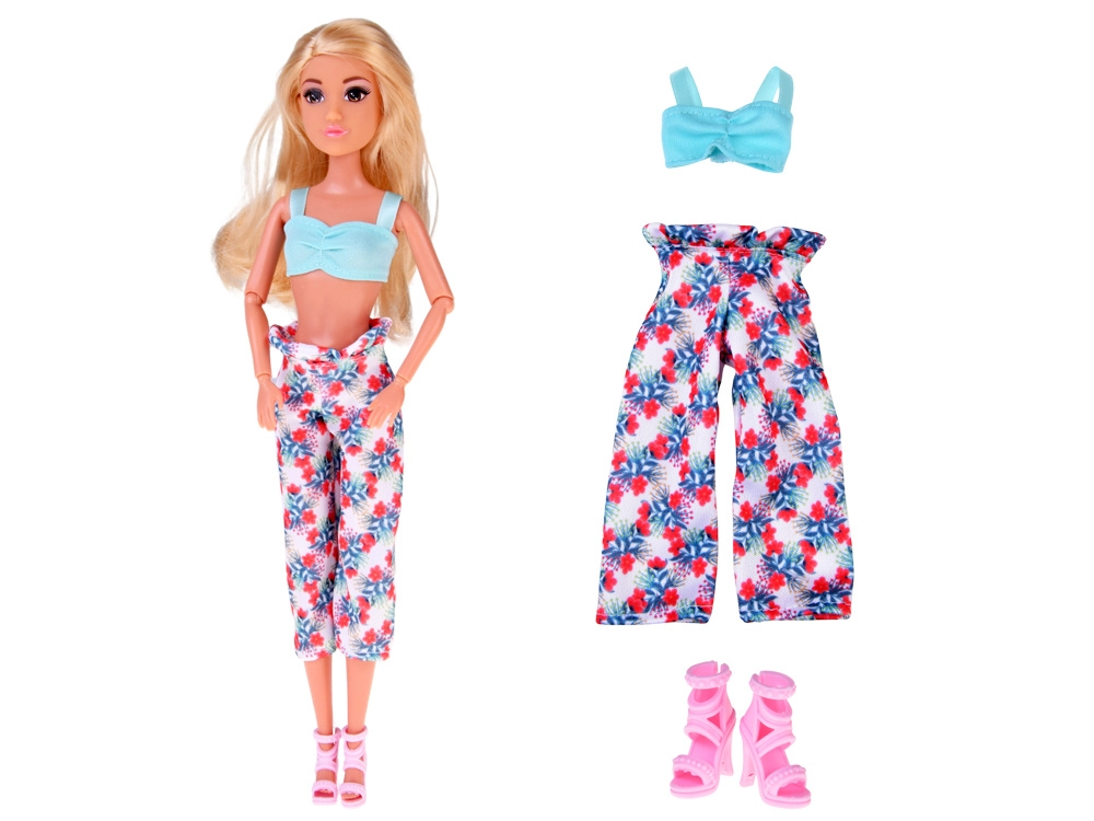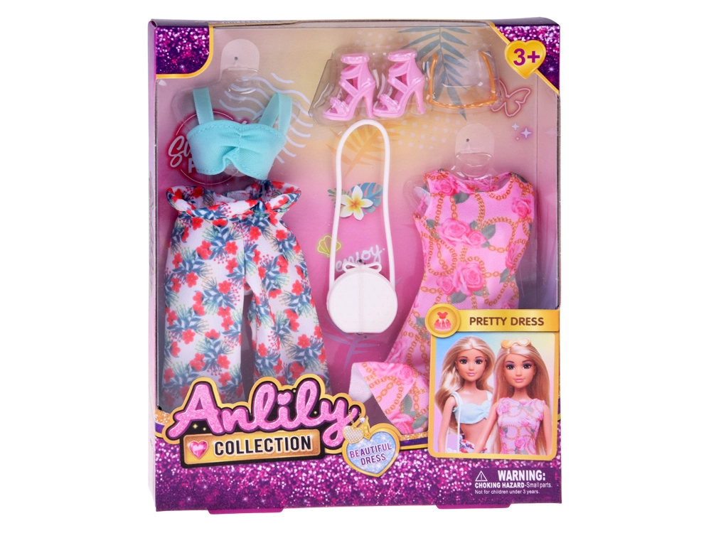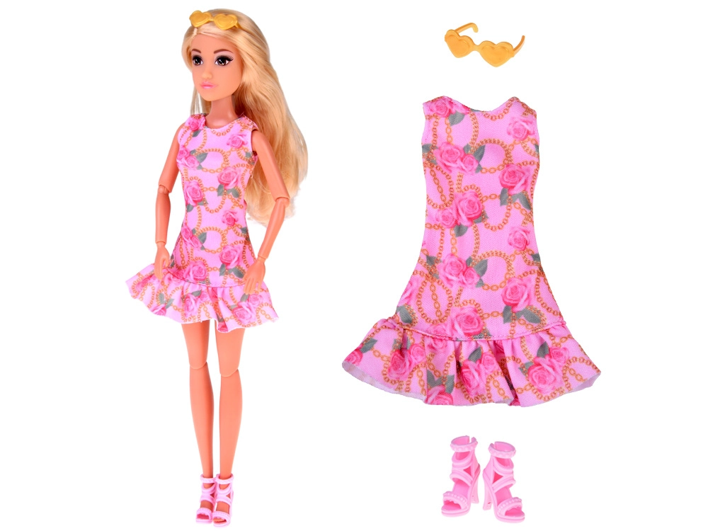 Obsah balení zahrnuje romantické růžové šaty s květinovým a řetízkovým vzorem a pohodlný turkusový top s květovanými širokými kalhotami. Styl dotvářejí růžové boty na podpatku, žluté brýle ve tvaru srdce, malá kabelka a další drobné doplňky. Skvělé pro mixování a kombinování outfitů a hraní si na módní stylistku.
