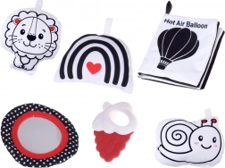 Měkké postavičky, kontrastní knížka, chrastítko, zrcátko a kousátko povzbuzují uchopování, koordinaci oko‑ruka i smyslové vnímání.