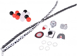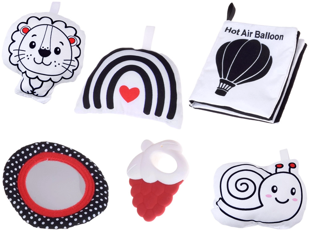 Černo‑bílé vzory s červenými akcenty podporují ostření, sledování pohybu a přirozenou pozornost novorozenců už od prvních dnů.
