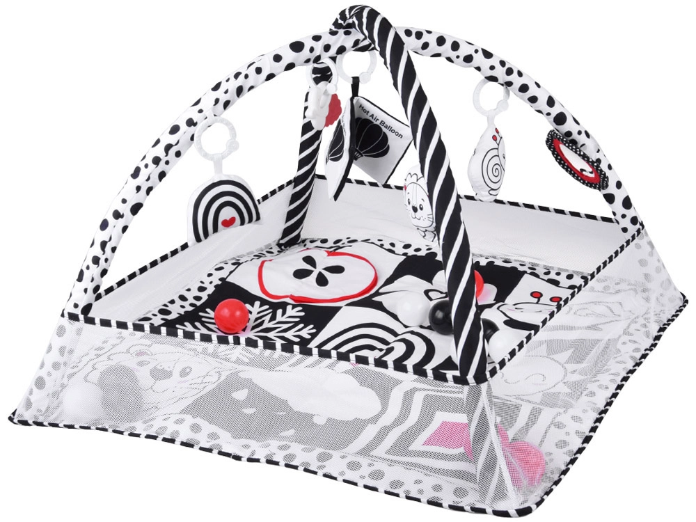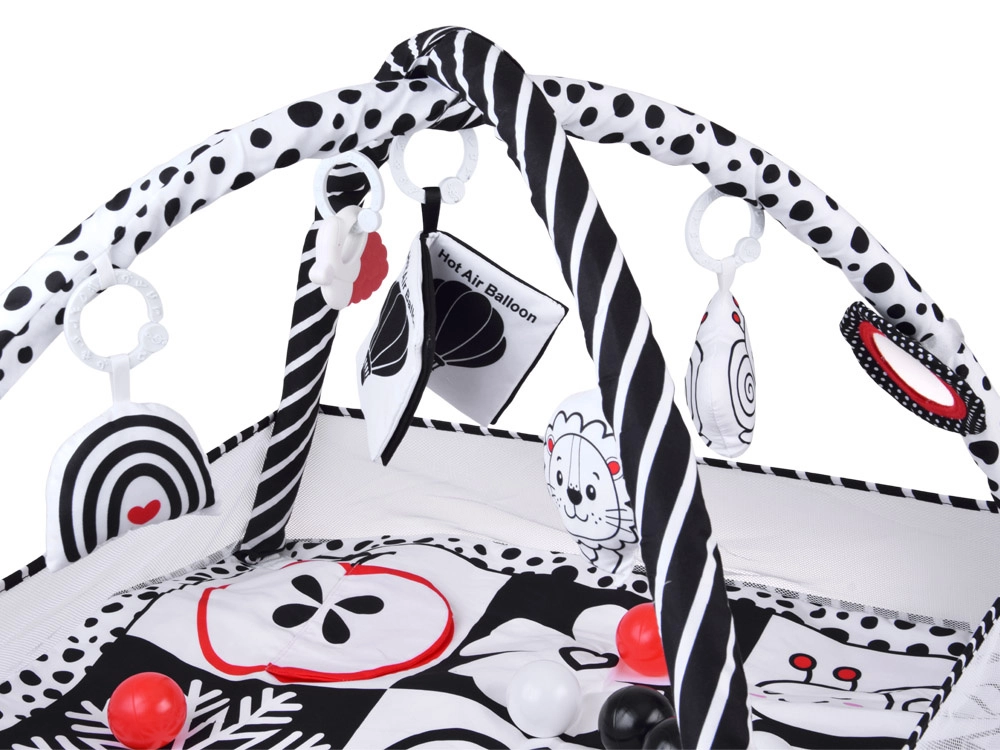 Dva měkce polstrované oblouky s různými závěsnými hračkami motivují k natahování, uchopení a pohybu. Síťované bočnice v okamžiku vytvoří z deky útulnou ohrádku s míčky pro bezpečné hraní pod dohledem dospělých.