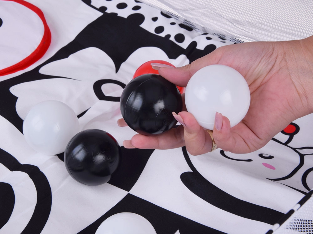 Prodyšná síťka udržuje hračky uvnitř a rodičům dává jasný přehled. Přiložené plastové míčky promění deku v zábavné mini hřiště.