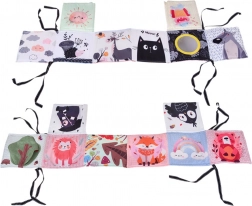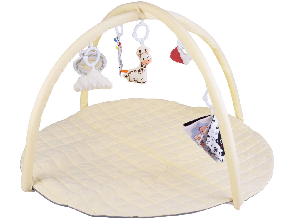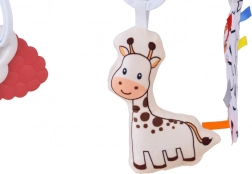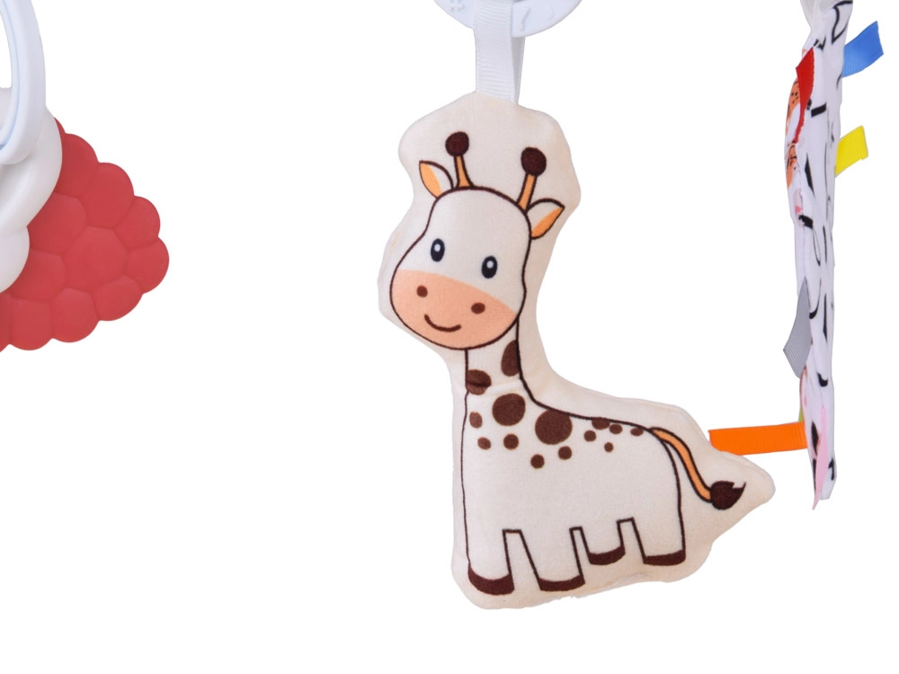 Dva pružné oblouky lze snadno odepnout pro praní či cestování. Na kroužcích zavěsíte různé hračky, které rozvíjejí zrak, sluch i hmat: plyšovou žirafu, měkoučký minky obláček, bezpečné zrcátko, kontrastní oboustrannou knížku, šustící čtverec s štítky i kousátko. Kontrastní motivy a rozmanité textury podporují soustředění a koordinaci oko–ruka.