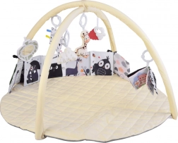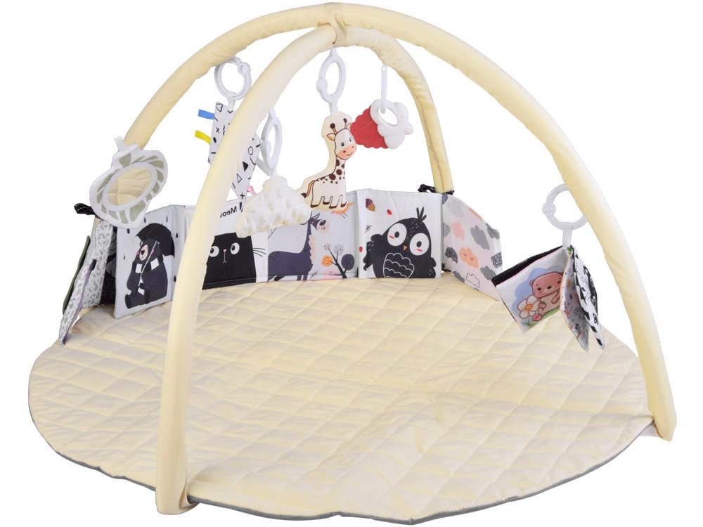 Tato edukativní hrací deka roste spolu s dítětem – od pozorování závěsných hraček vleže, přes trénink úchopu a zvedání hlavičky, až po první přetáčení a sezení. Příjemně měkká, prošívaná a lehce polstrovaná podložka izoluje od studené a tvrdé podlahy a vytváří útulnou a bezpečnou zónu pro každodenní objevování.