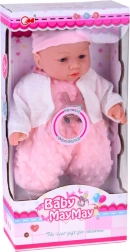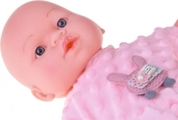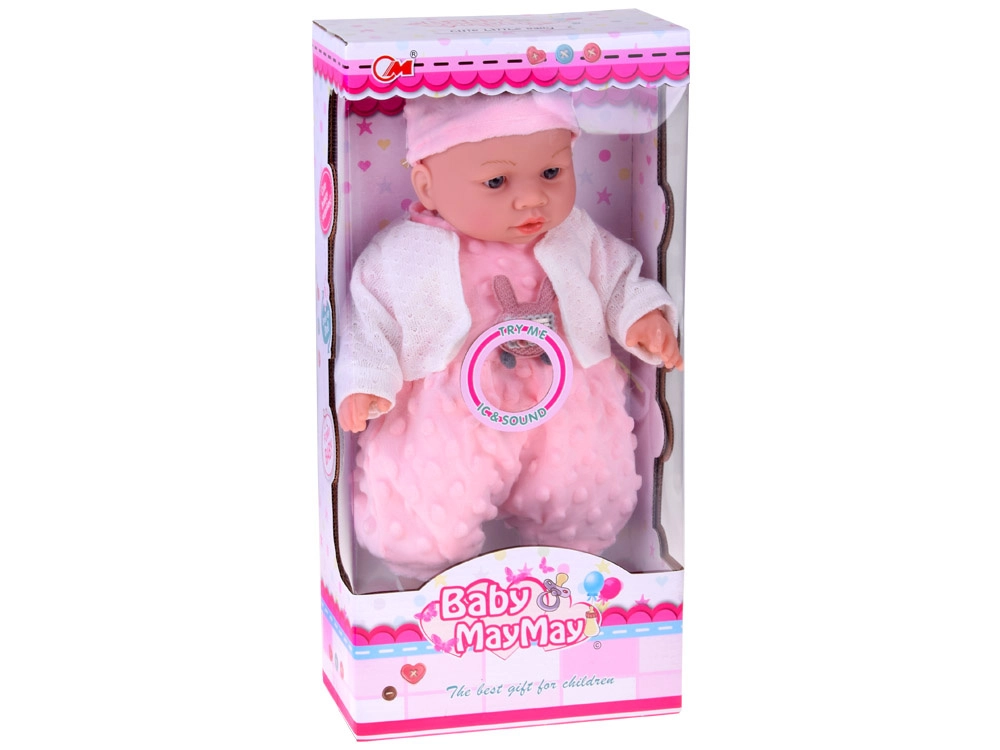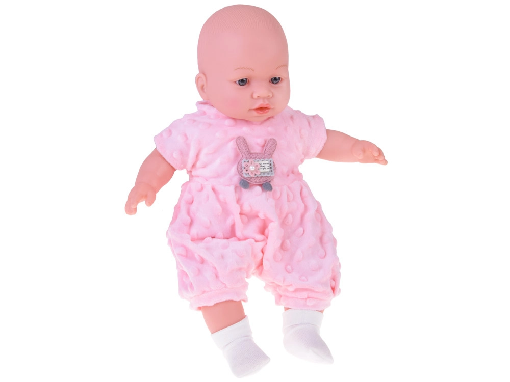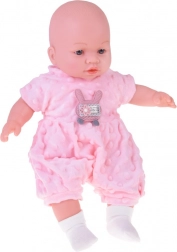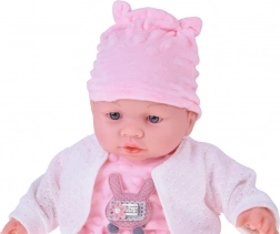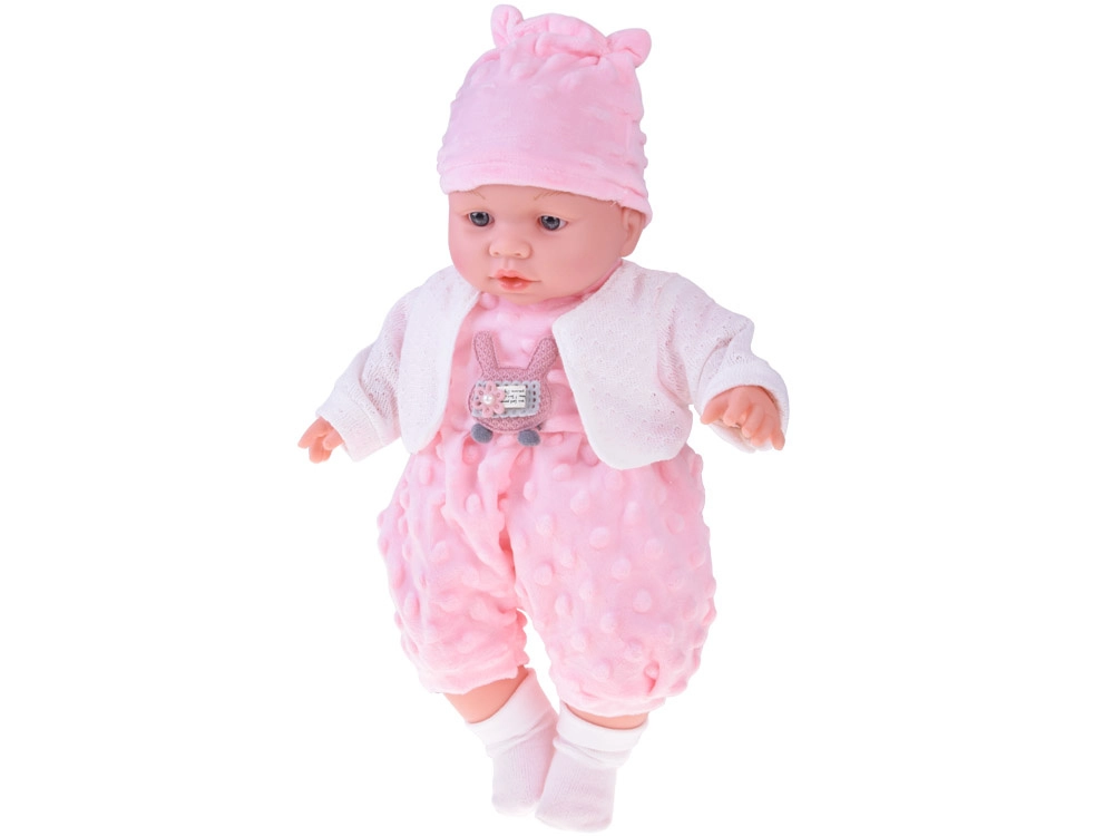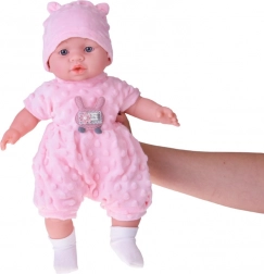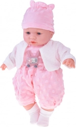 Roztomilé miminko o výšce 40 cm potěší každé dítě už od 12 měsíců. Díky měkkému textilnímu tělíčku se skvěle mazlí, je lehké na nošení a má realistické detaily obličeje. Po stisku bříška vydává různé zvuky – žvatlá, směje se, poplakává a mručí. Součástí je hebký růžový rampers z minky s aplikací, čepička s oušky, bílý kardigan a ponožky.