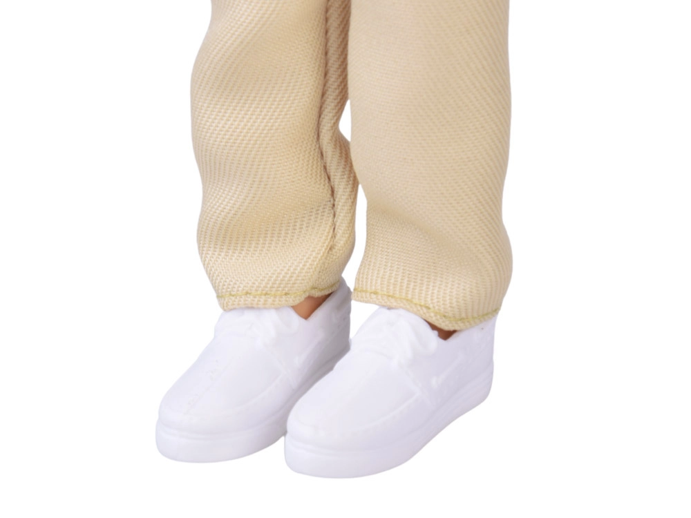 Elegantní košile s límečkem, světlé kalhoty a bílé boty dodají panence moderní vzhled. Oblečení lze svlékat a kombinovat.