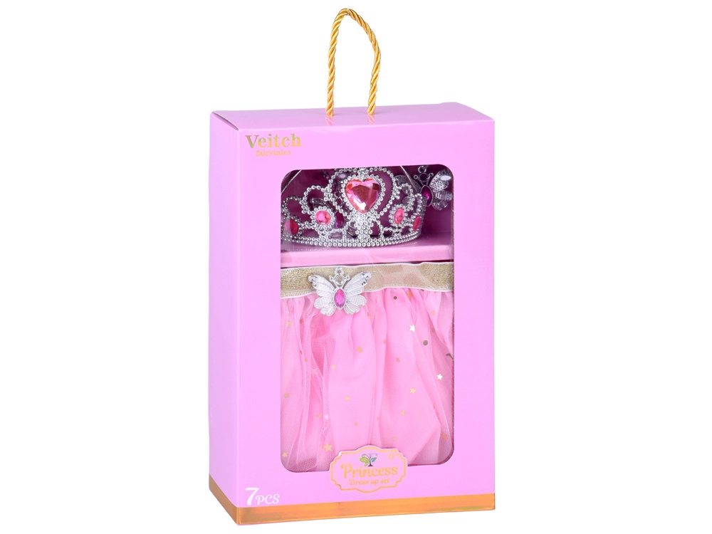 Okouzlete fantazii dítěte s tímto kouzelným setem pro převlékání: růžová třpytivá sukně s zlatým pružným pasem, stříbrná korunka s růžovými kamínky, náhrdelník s motýlkem, prstýnek a motýlí náušnice. Ideální pro pohádkové hry, narozeninové oslavy i karneval.