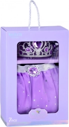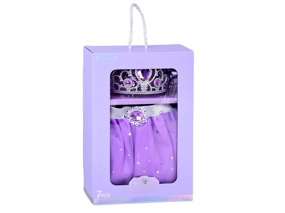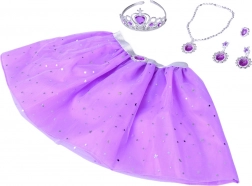Kouzelná sada pro malé princezny přináší fialovou tutu sukni s hvězdičkami a bohaté dopňky – korunku, náhrdelník, prsten a náušnice. Díky elastickému pasu a lehounkému tylu je sukně pohodlná na celodenní hraní. Šperky s fialovými kamínky rozzáří každý kostým a podpoří kreativní, princeznovskou hru.
