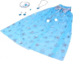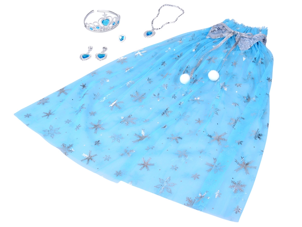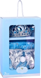 Součástí je kompletní sada šperků: plastová korunka s modrými „drahokamy“, náhrdelník s kapkovitým přívěskem, výrazný prsten a klipsové náušnice s srdcovými kameny. Vše je lehké, pohodlné a uzpůsobené pro dětské převlékání.