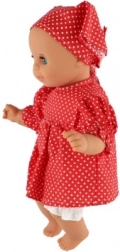 Výrazné červené šaty s bílými puntíky a ladící šátek dodávají panence okouzlující retro vzhled.