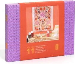 Balení obsahuje barvy na textil, štětce, klipsy, misku na barvu, šablonu a hedvábný šátek. Stačí rozbalit a začít malovat.