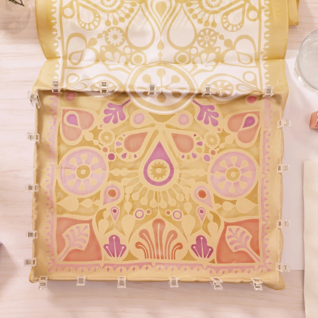 - Hedvábný šátek, textilní barvy, 2 štětce, klipsy na uchycení, miska na barvu, šablona/motiv