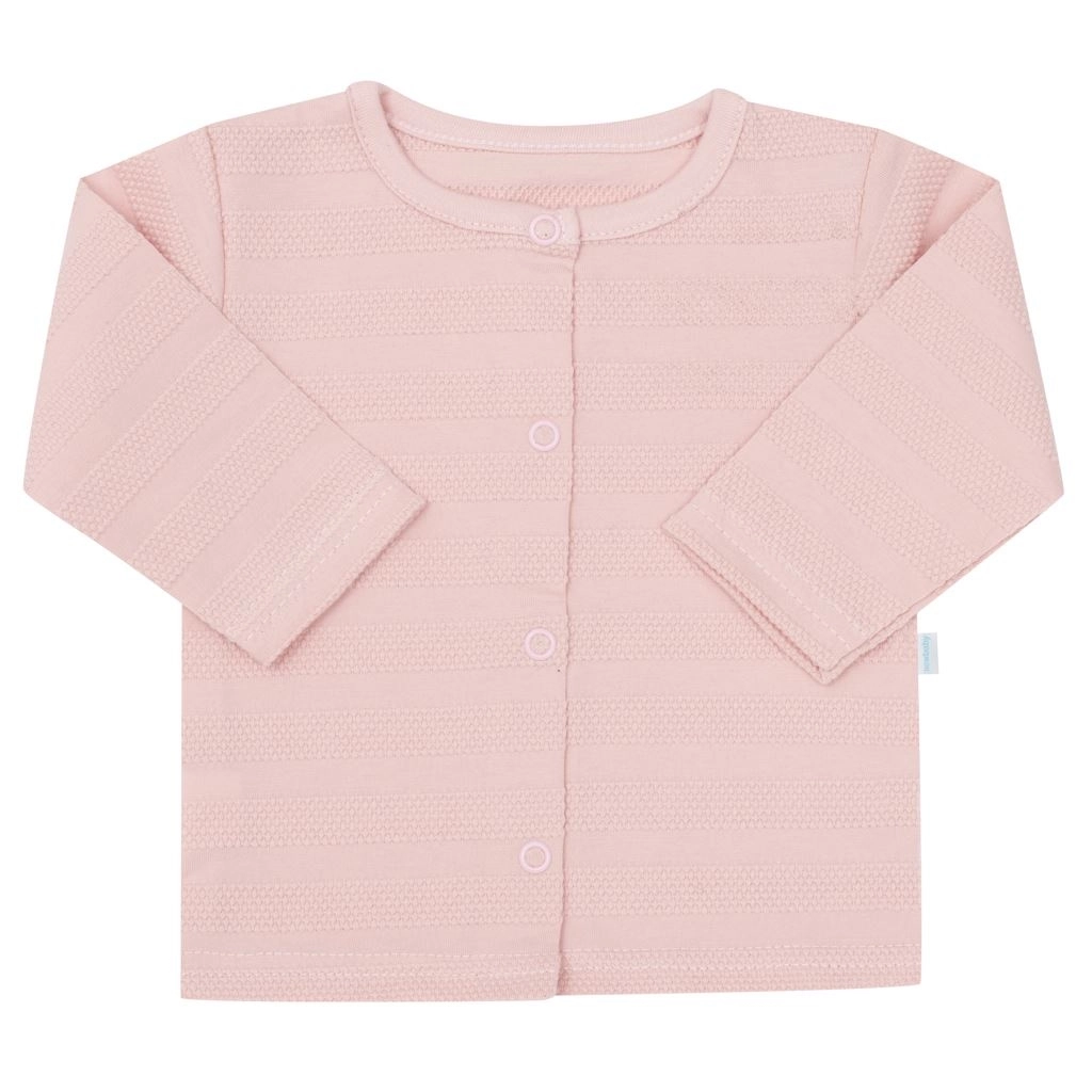 V sadě najdete: celorozepínací body s dlouhým rukávem (boční zapínání a cvočky mezi nožkami), dupačky (cvočky na ramínkách a v rozkroku), kabátek na cvočky po celé délce a měkoučkou čepičku se širokým lemem. Moderní, decentní design a sladěná růžová barva potěší každého rodiče.