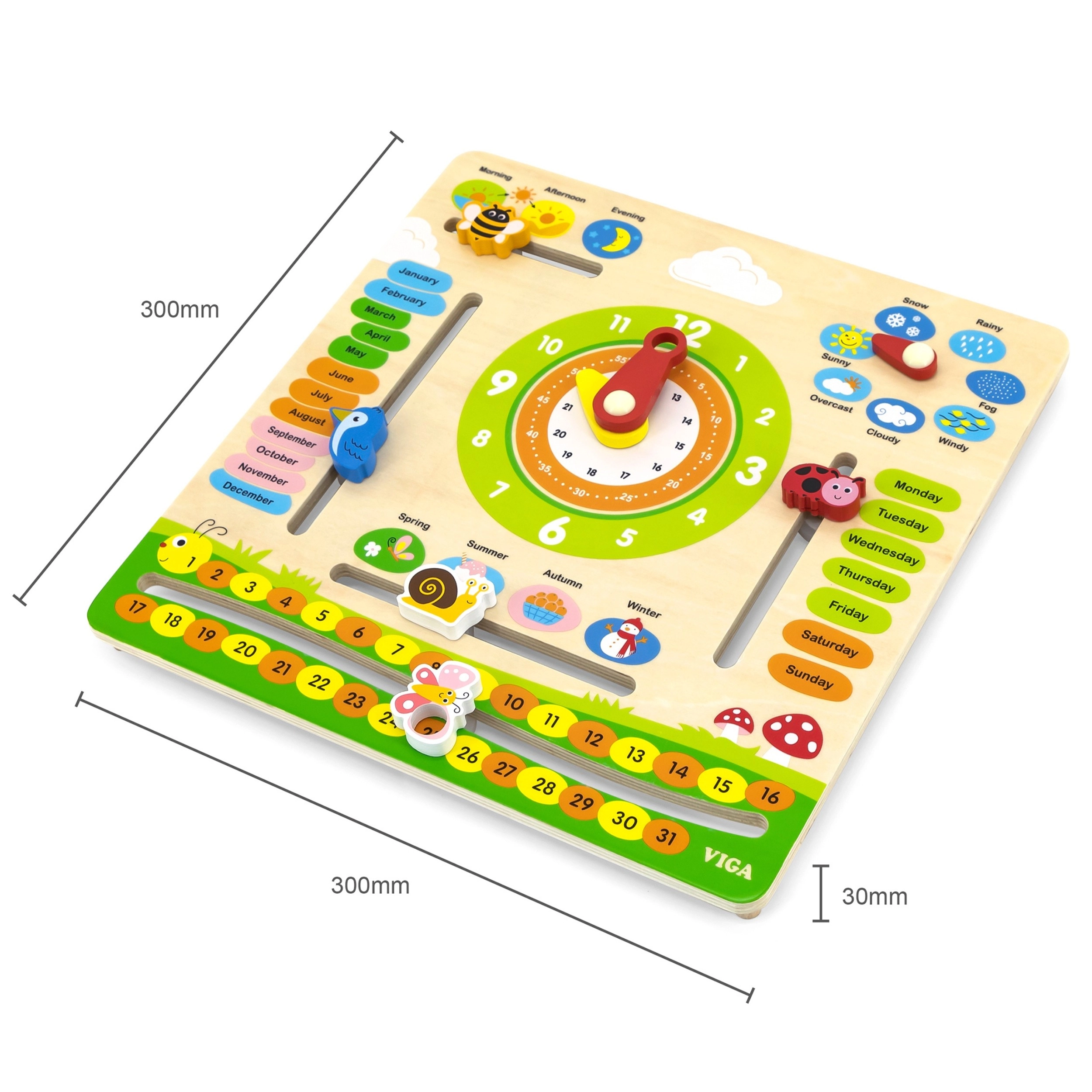Dřevěná výuková tabule Viga spojuje kalendář, hodiny a témata počasí do jednoho přehledného panelu. Děti se hravou formou naučí názvy měsíců, dnů v týdnu, ročních období i počasí v angličtině a zároveň si procvičí určování času na analogových hodinách. Barevné prvky a robustní zpracování motivují k každodennímu používání.