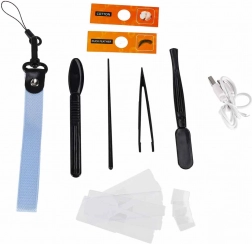 Stabilní základna, odnímatelný displej s mikroskopem, USB‑C nabíjecí kabel, 2× vzorek (kachní pírko, bavlněné vlákno), 4× podložní sklíčko, 4× krycí sklíčko, nádobka na kapalinu, nástavec na zkumavky, látkový popruh, nástroje (skalpel, jehla/špice, lopatka, pinzeta), návod
