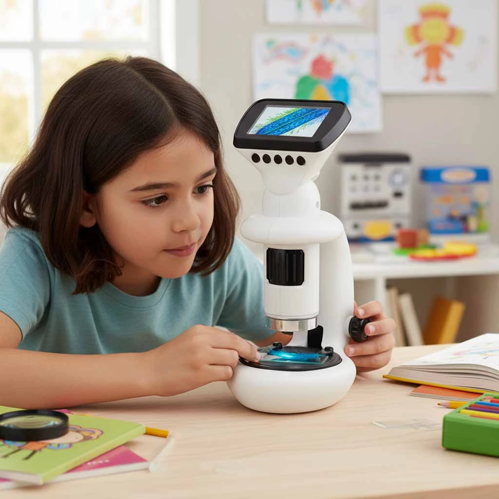 Objevte svět mikrosvěta s tímto digitálním mikroskopem 3v1 s 2,4" LCD displejem, Wi‑Fi připojením a zvětšením 200× až 1000×. Umožňuje fotografování a nahrávání videí, nabízí integrované LED osvětlení a funguje stolně i přenosně – ideální pro děti od 6 let, domácí laboratoř i vzdělávání STEM.