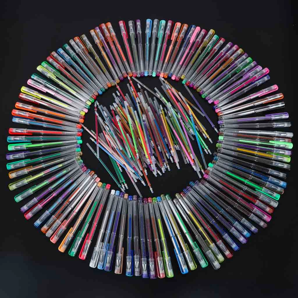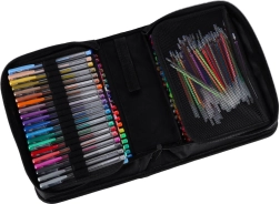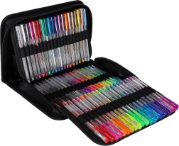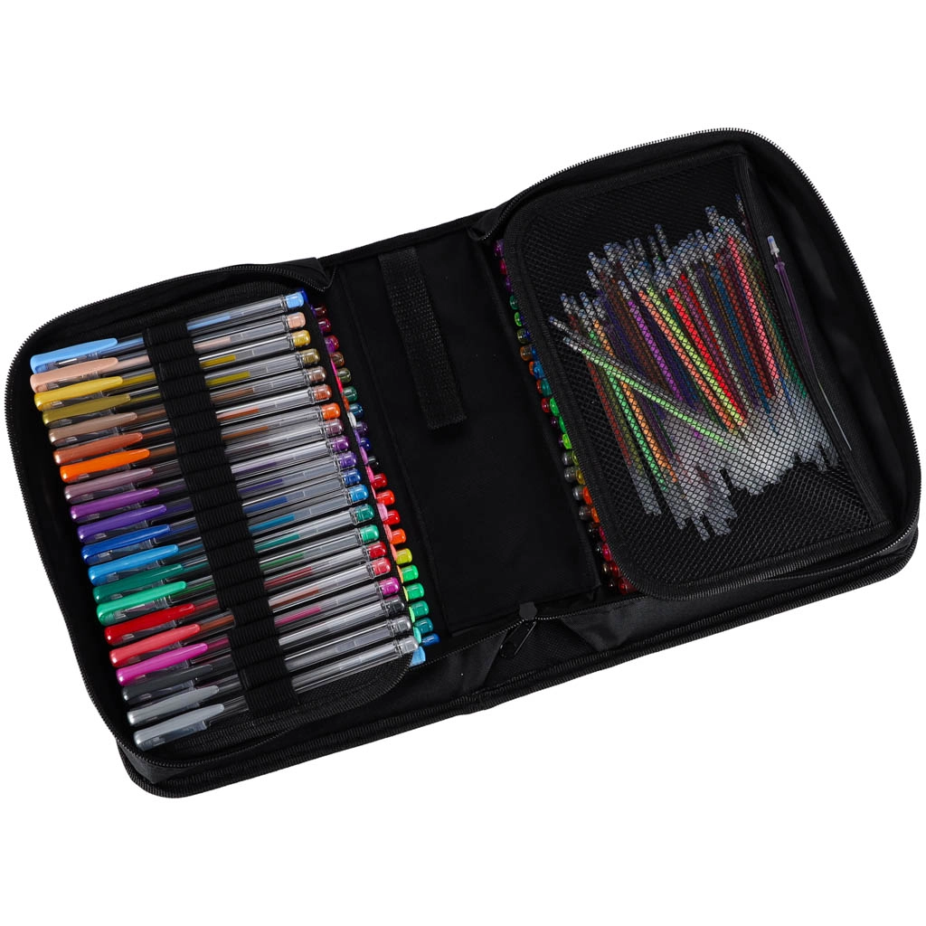 Objevte univerzální set pro školu, kancelář i volný čas: 100 gelových per v bohaté paletě barev a efektů, navíc se 100 náhradními náplněmi. Přehledné rozkládací pouzdro na zip drží každé pero na svém místě, takže máte všechny barvy vždy po ruce a bezpečně uložené.