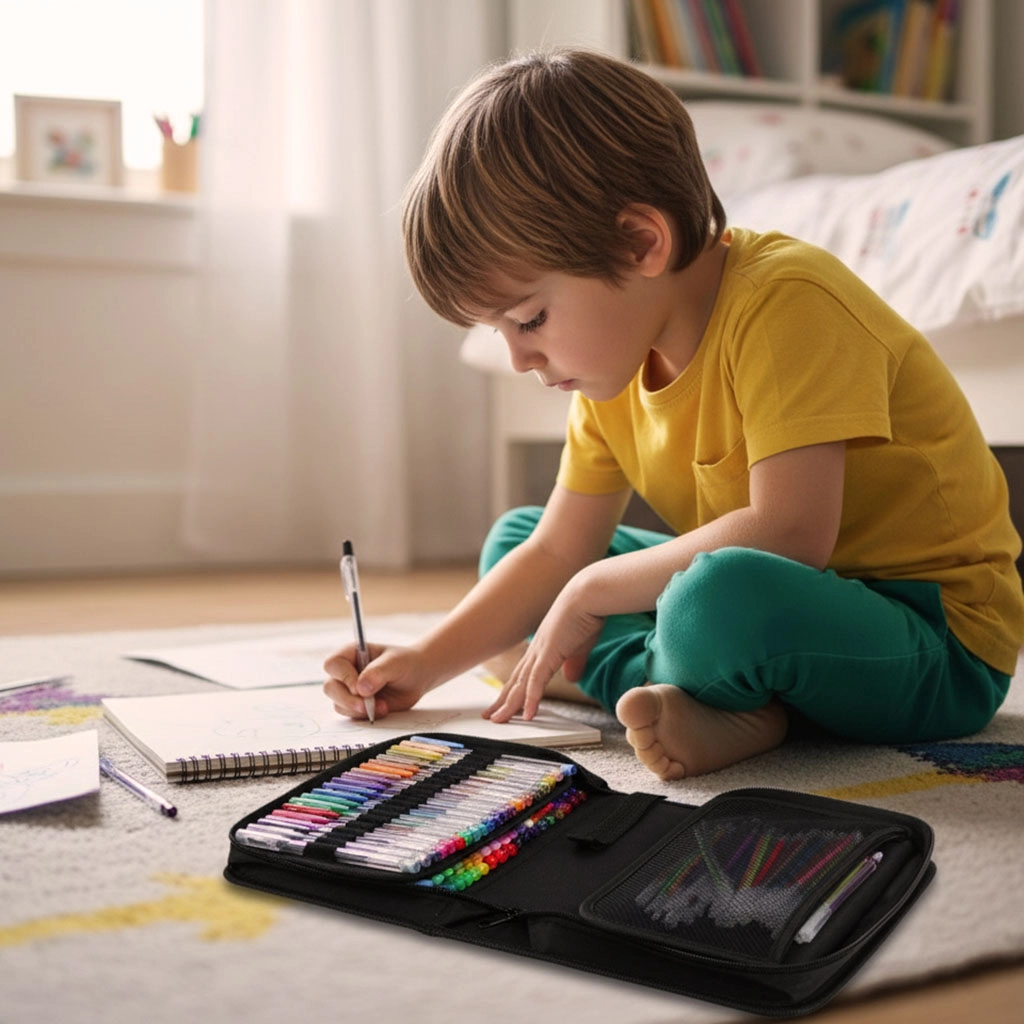 Rozkládací pouzdro s elastickými úchyty udržuje pera přehledně seřazená a chráněná. Snadno je vezmete kamkoli s sebou.