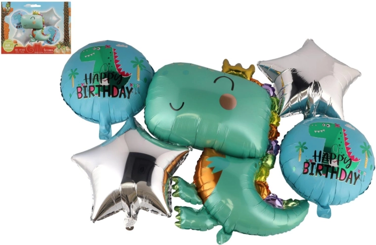 - 5 ks balónků (dinosaurus s korunkou, 2× kulatý Happy Birthday, 2× hvězda)