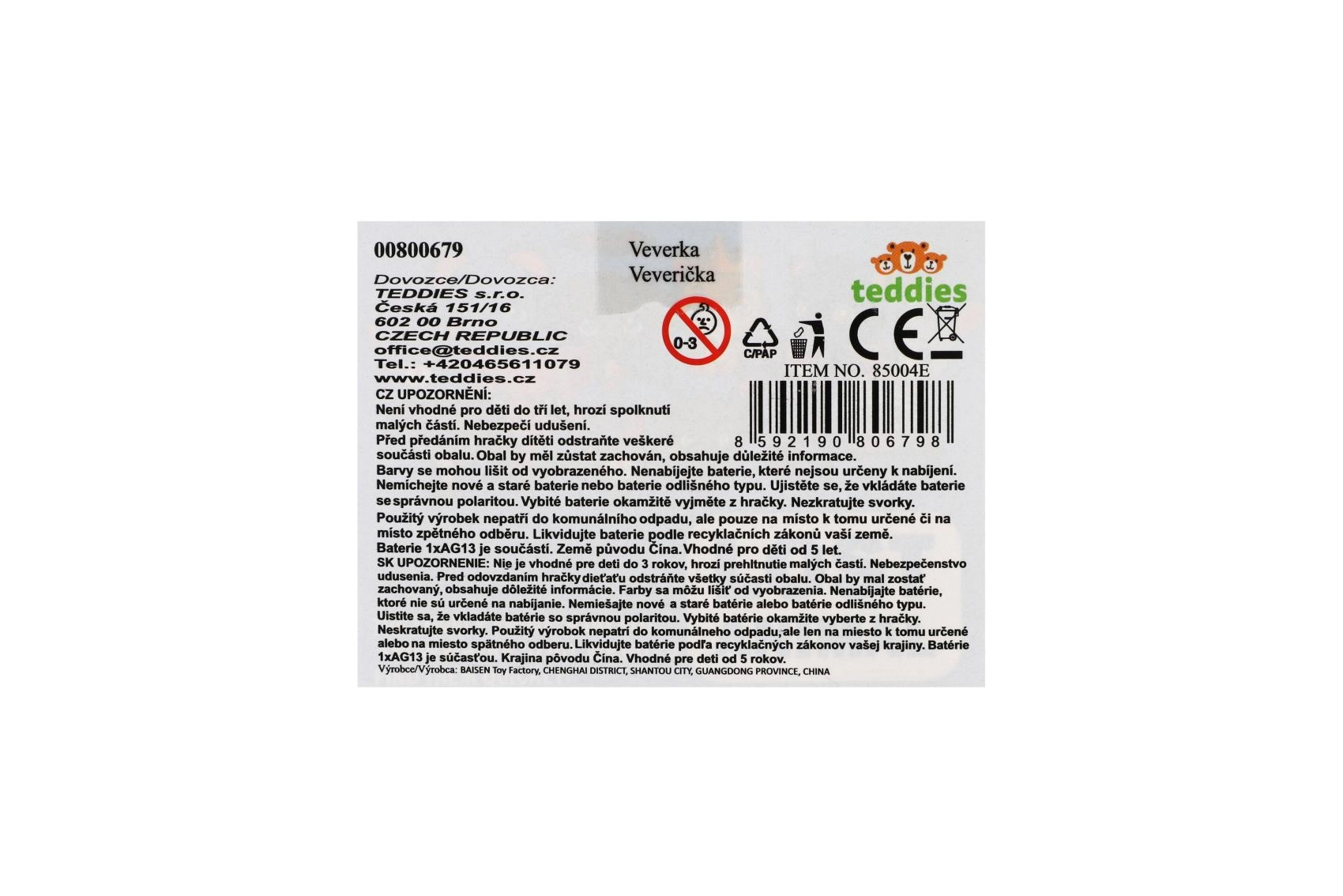 Roztomilá interaktivní veverka s malým plastovým žaludem potěší děti od 3 let. Po zapnutí ON/OFF se sama pohybuje, stimuluje zrak, sluch i vnímání pohybu a díky chlupatému povrchu je příjemná na dotek. Dostupná ve 3 barevných variantách, baleno v krabičce 9×7×9 cm.