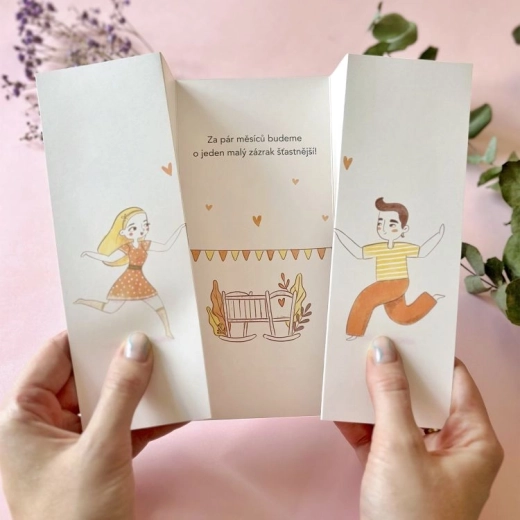 Uděláte radost rodině i přátelům pomocí tohoto originálního přání k odhalení pohlaví. Díky otevíracímu provedení a předtištěnému textu je oznámení rychlé, emotivní a krásně stylové. Přáníčko je dostatečně velké pro vlastní věnování a podpisy.