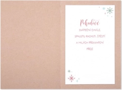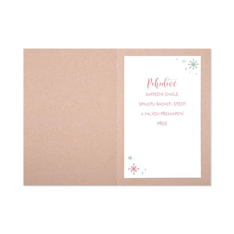 Text uvnitř přání: „Ty opravdové dárky nenajdete pod vánočním stromečkem... ty najdete všude okolo... V dětském smíchu, v tvářích svých nejbližších, ve vločkách snášejících se z nebe a ve svém srdci. Krásné a pohodové vánoční svátky přeje...”