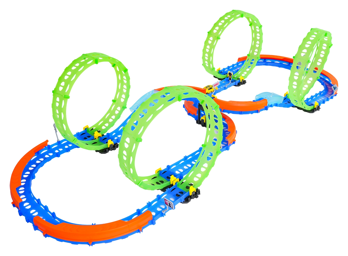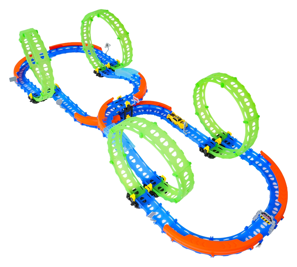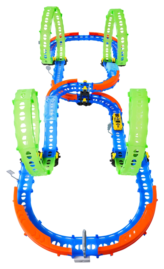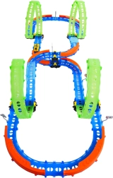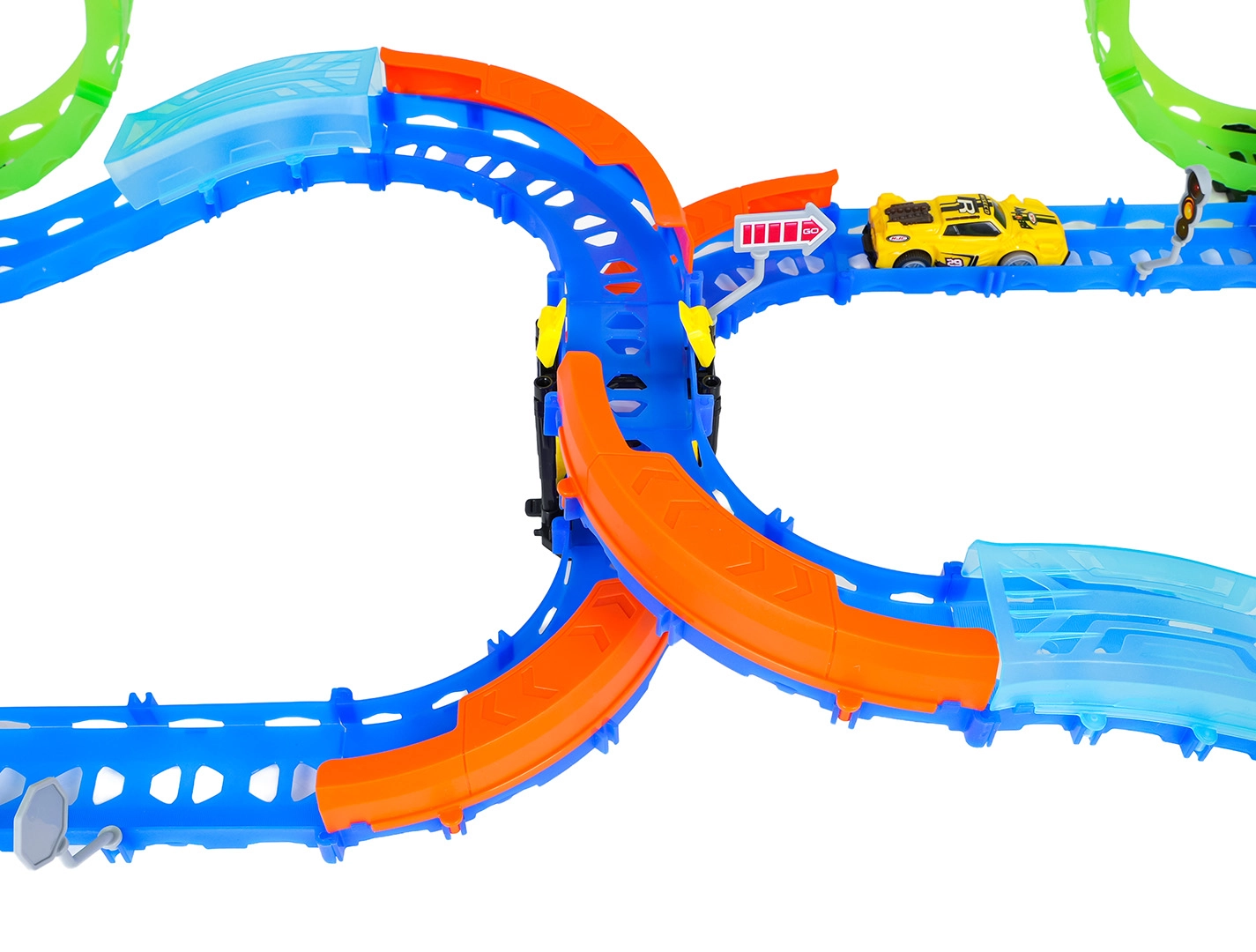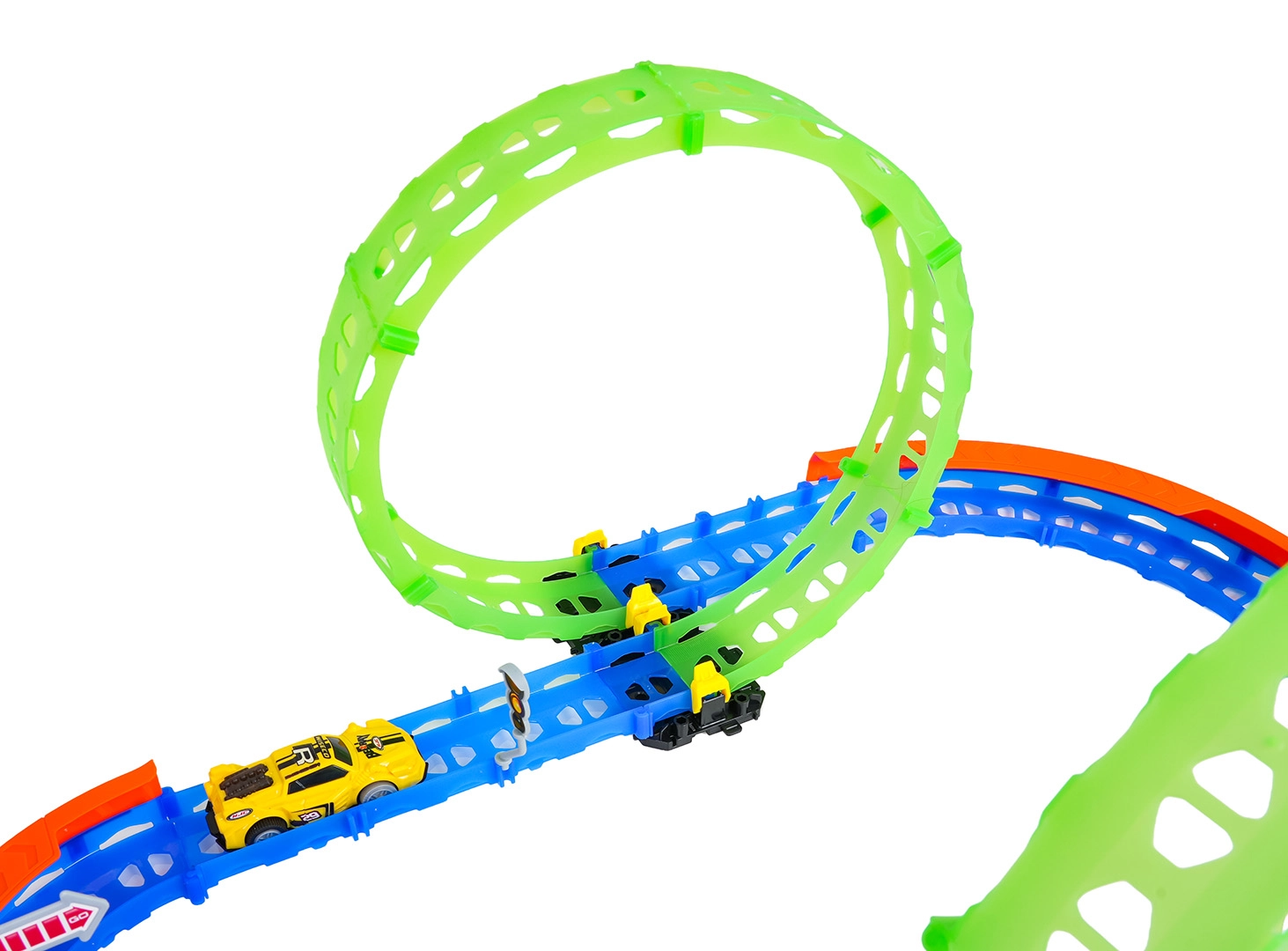 Tato barevná závodní dráha nabídne parádní kaskadérské jízdy i kreativní stavění. Díky fluorescenčním smyčkám a světelnému efektu autíčka vynikne zejména ve tmě, kde se promění v zářivou trasu plnou napětí. Robustní zábradlí v zatáčkách pomáhá udržet autíčko bezpečně na trati.