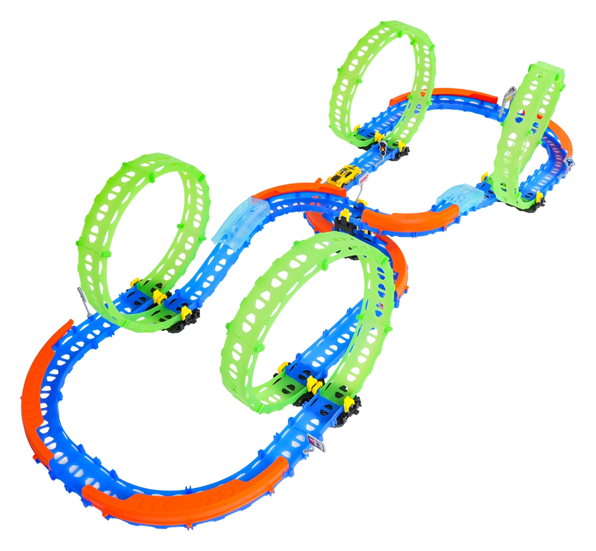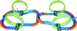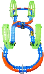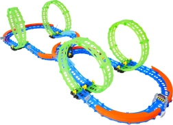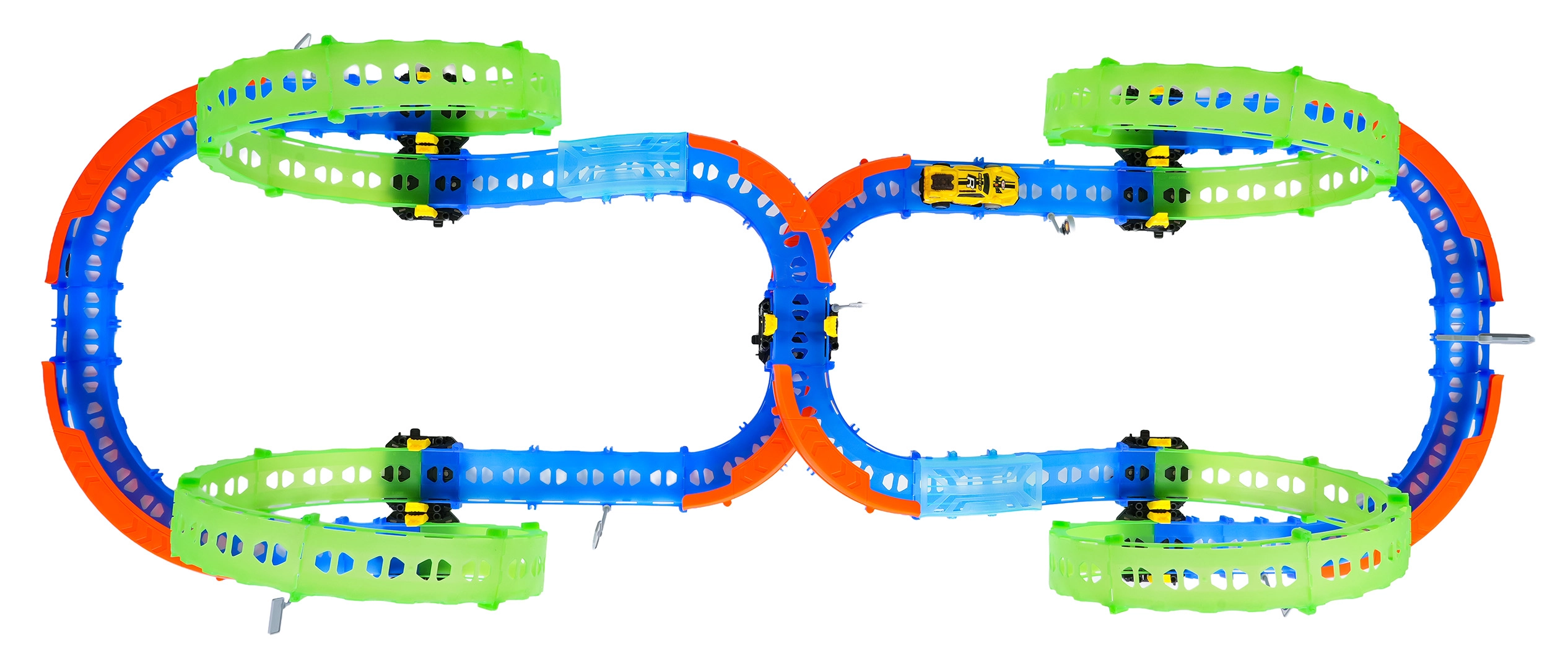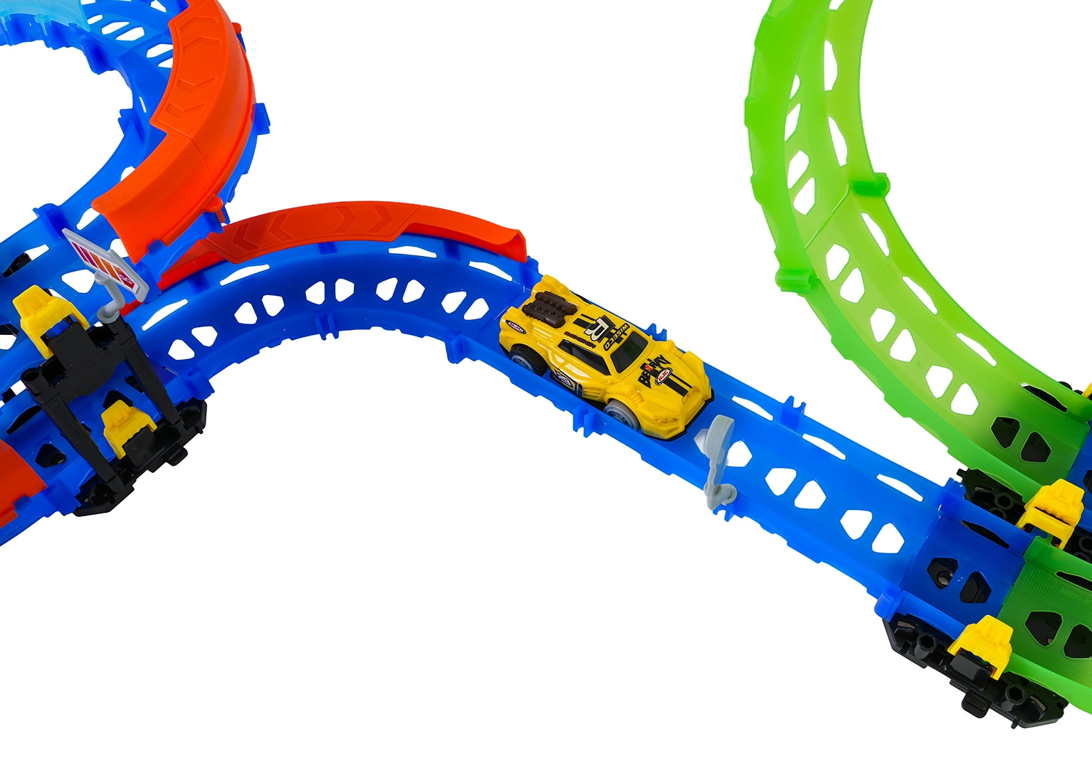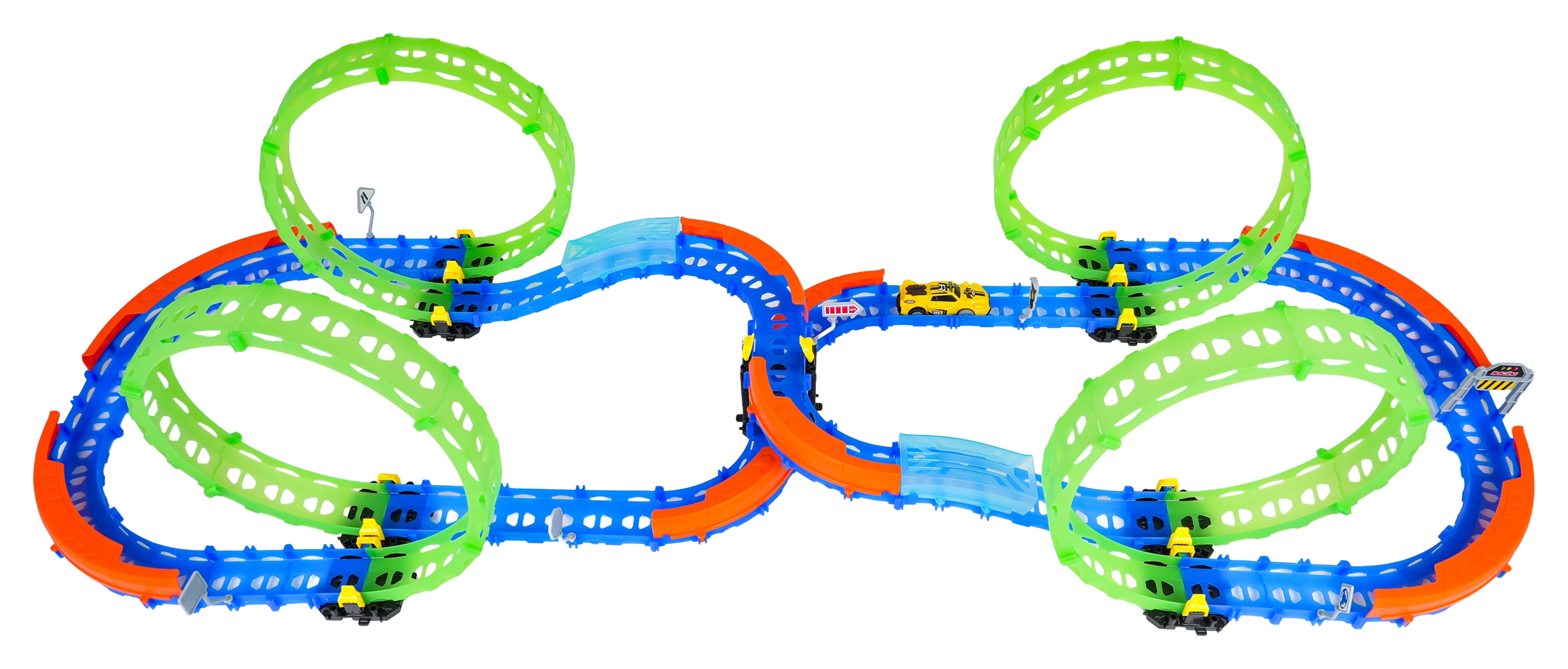 Tato barevná závodní dráha nabídne parádní kaskadérské jízdy i kreativní stavění. Díky fluorescenčním smyčkám a světelnému efektu autíčka vynikne zejména ve tmě, kde se promění v zářivou trasu plnou napětí. Robustní zábradlí v zatáčkách pomáhá udržet autíčko bezpečně na trati.