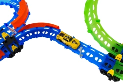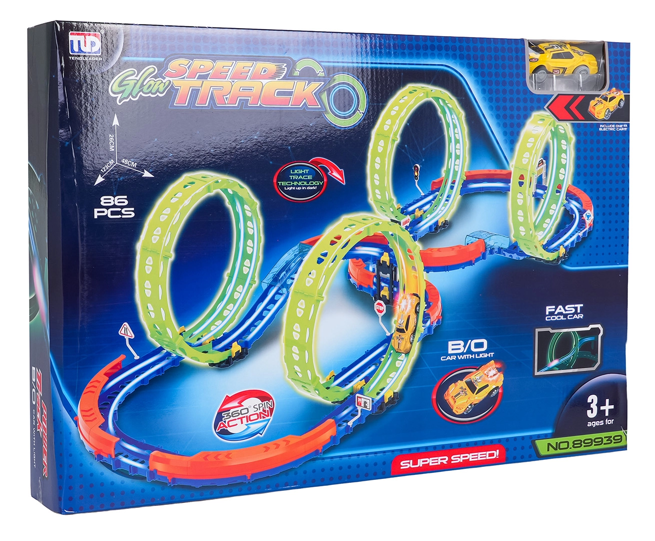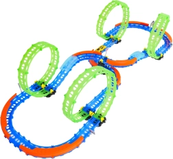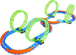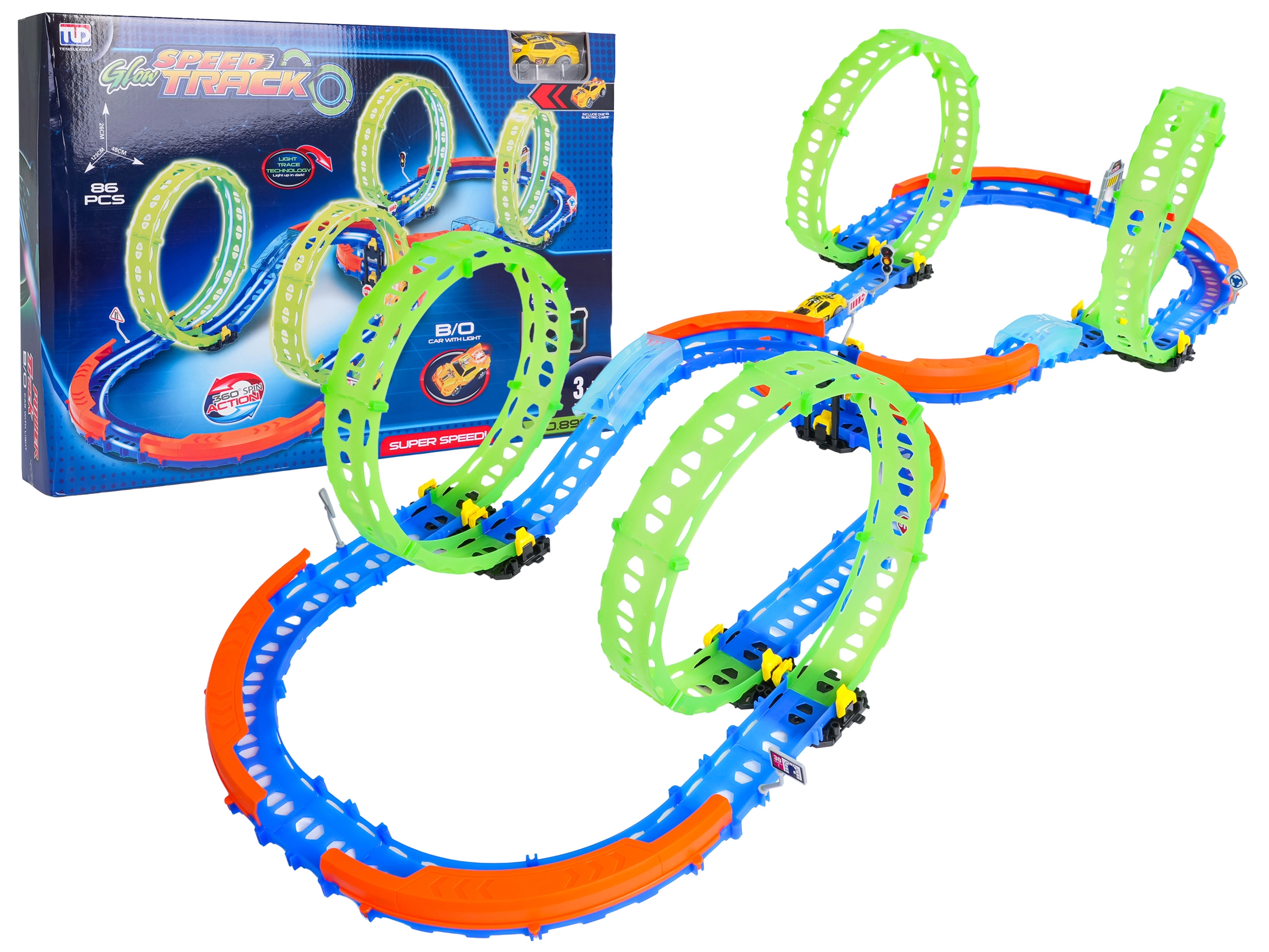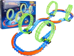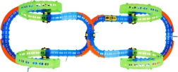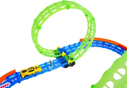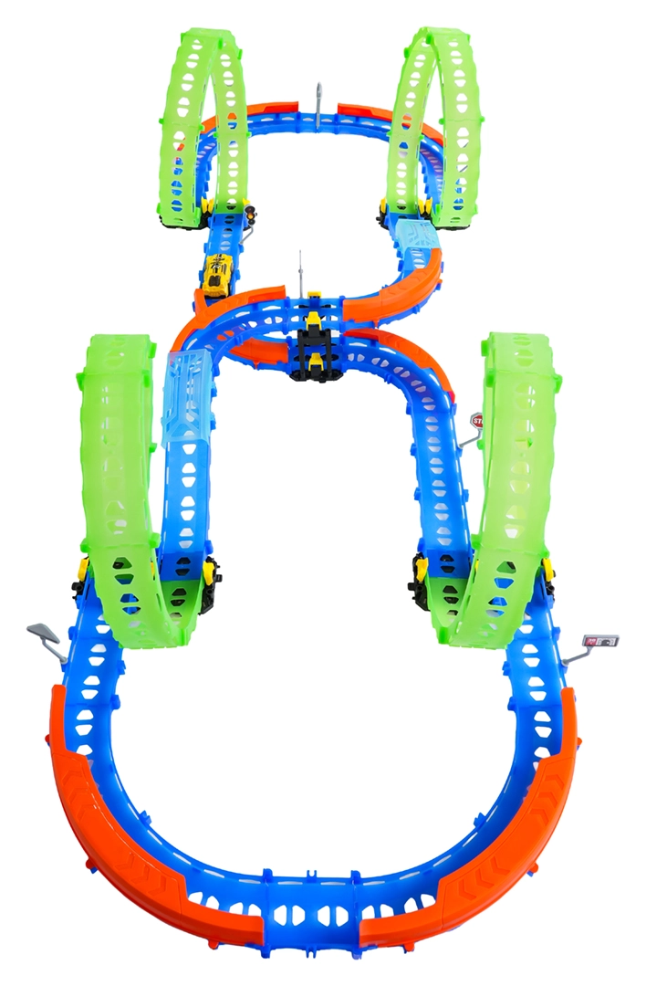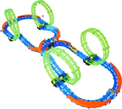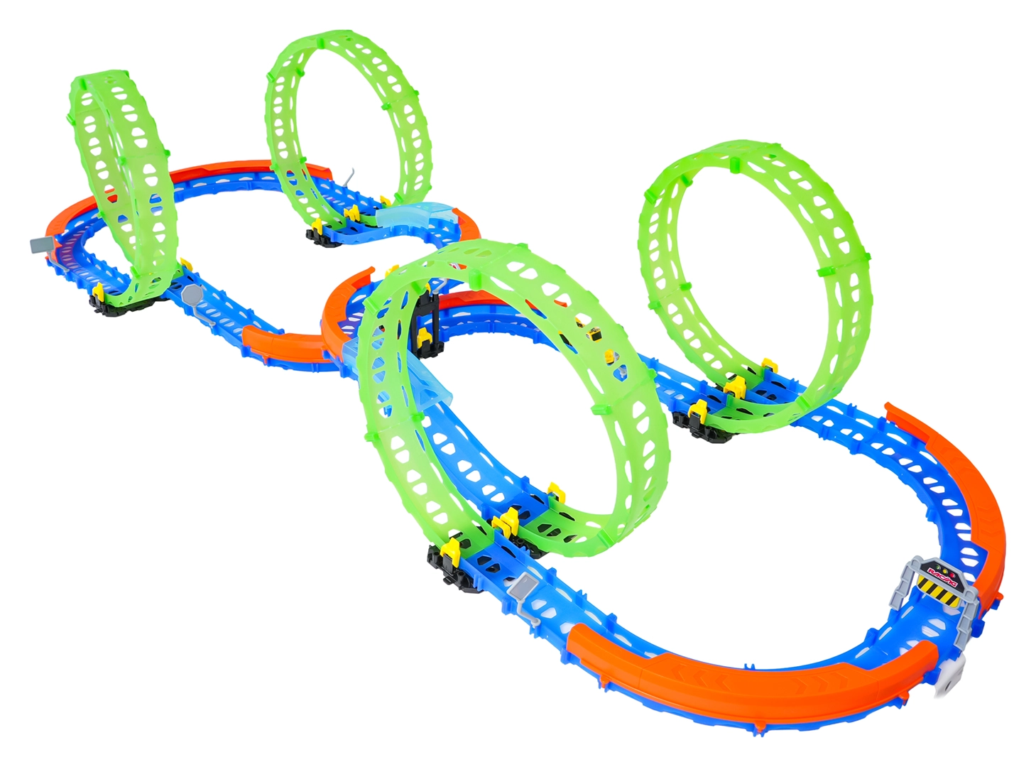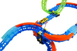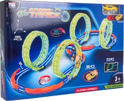 Tato barevná závodní dráha nabídne parádní kaskadérské jízdy i kreativní stavění. Díky fluorescenčním smyčkám a světelnému efektu autíčka vynikne zejména ve tmě, kde se promění v zářivou trasu plnou napětí. Robustní zábradlí v zatáčkách pomáhá udržet autíčko bezpečně na trati.