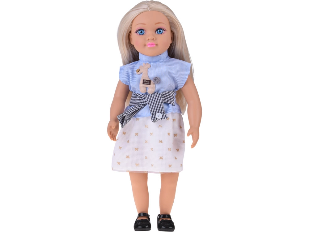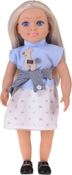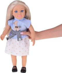 Panenka je oblečena do elegantní kombinace – modrý top s proužky a aplikací, šik pásek a krémová sukně se zlatými motivy tvoří harmonický outfit doplněný černými balerínkami. Díky pohyblivým rukám, nohám a hlavě lze panenku snadno posadit i naaranžovat do různých póz pro scénky a vyprávění příběhů.
