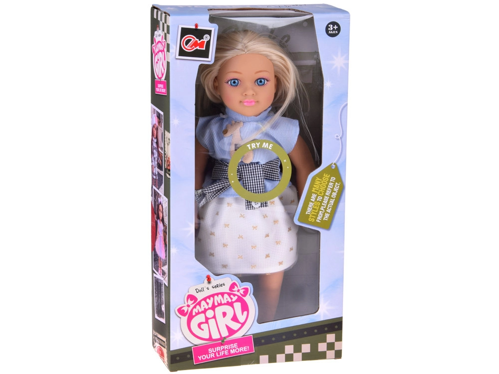 Panenka má klouby v rukou a nohách i otočnou hlavu, takže snadno sedí a pózuje. Modré oči a jemné rysy působí přirozeně.