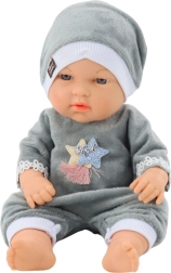 Roztomilá panenka miminko v šedém pyžámku a čepičce potěší každé dítě. Má realistické rysy obličeje, pohyblivé ručičky, nožičky a hlavičku a je příjemná na dotek díky měkkému oblečku. Díky kompaktní velikosti 30 cm je lehká, snadno se nosí a ideální na hraní doma i na cestách.