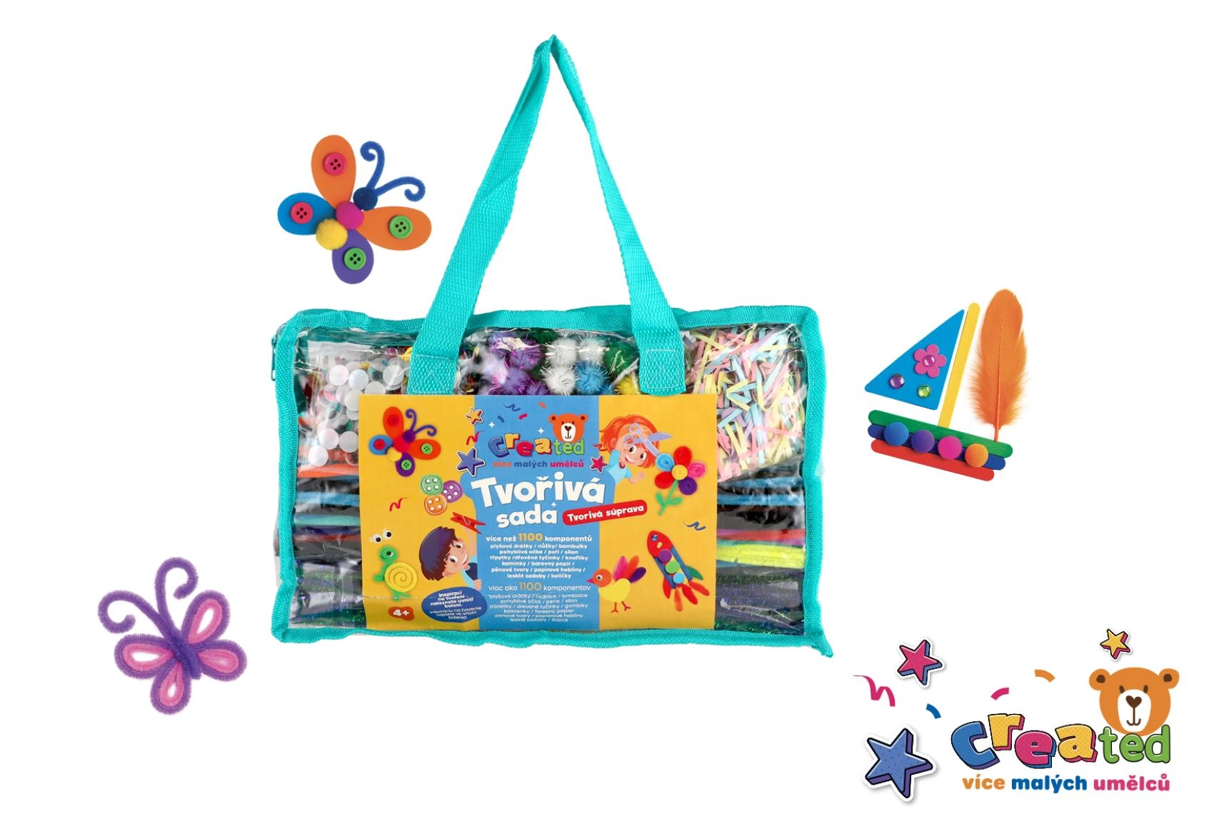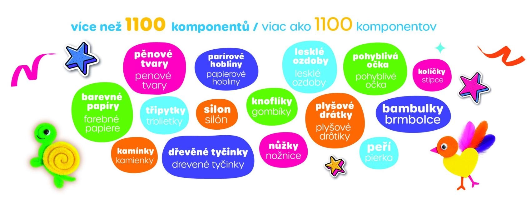 Korálky, pom‑pomy, chlupaté drátky, pěnové tvary a pírka dětem umožní tvořit obrázky, postavičky, zvířátka i dekorace přesně podle jejich představ.