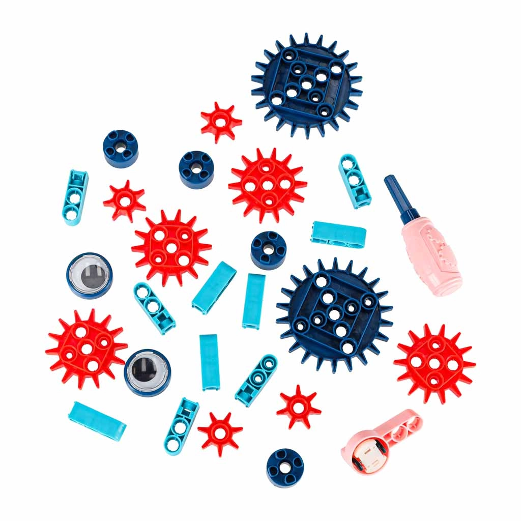Různě velká ozubená kola, hřídele a spojky umožňují převody a rotaci. Děti si prakticky vyzkouší principy mechaniky a přenosu pohybu.