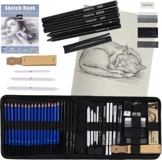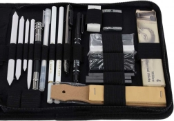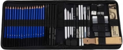 Tato komplexní sada pro skicování je ideální pro začátečníky i pokročilé. Najdete v ní grafitové tužky od 12B po 5H, černé i bílé uhel v tužce, štyfty pro plošné tahy a papírové estompy pro plynulé přechody tónů. Vše je přehledně uspořádáno v odolném nylonovém pouzdře, které drží vybavení bezpečně na svém místě.