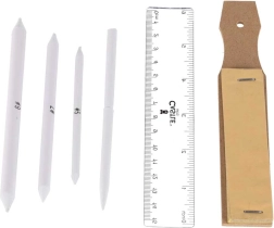 Papírové estompy různých velikostí, brousicí destička a pravítko pro čisté přechody, detaily i přesné linie.