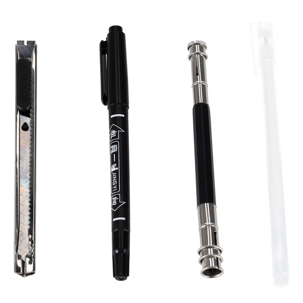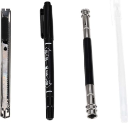 - bílý gelový popisovač, černý marker, prodlužovač na tužky, nožík na papír, brousicí destička, pravítko
