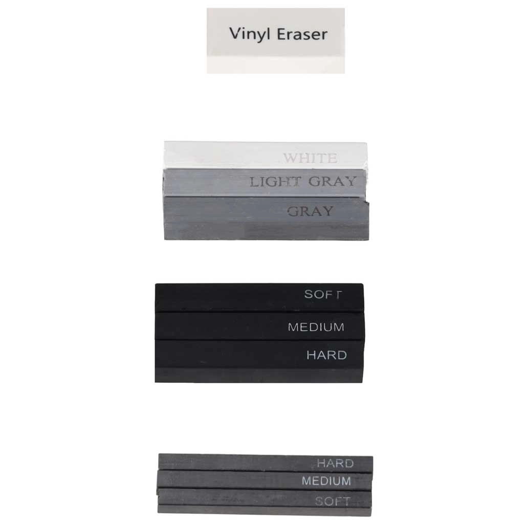 Pro zvýraznění světel využijete bílý gelový popisovač a bílé uhel tužky, pro korekce pak vinylovou a tvárnou (chlebovou) gumu. Nechybí ořezávátka, prodloužení na tužky, pravítko ani brousicí destička pro perfektní tvar hrotů.