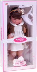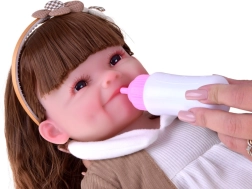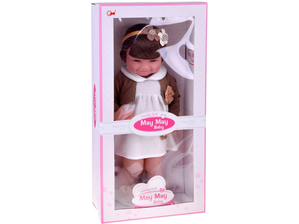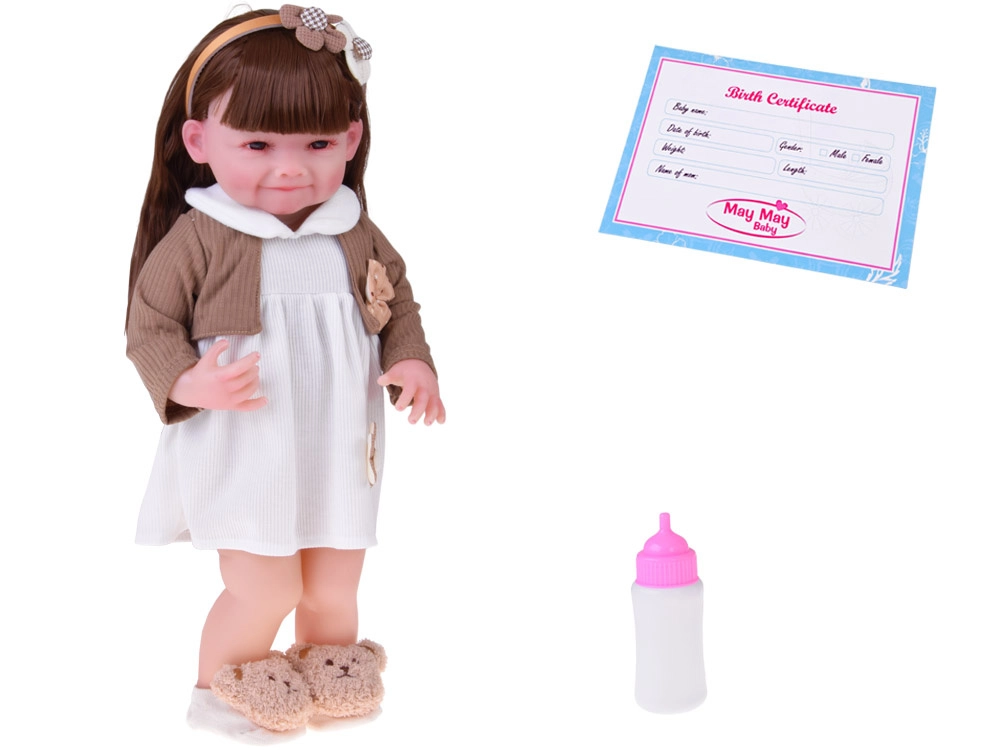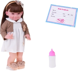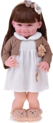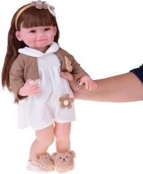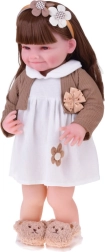 Tato krásná panenka je oblečená do bílé šatičky s květinovou aplikací a hnědého svetříku s mašličkou. Outfit doplňují měkké papuče ve tvaru medvídků a béžová čelenka s ozdobou, které podtrhují něžný, dětsky sladký vzhled. Díky realistickému obličeji a dlouhým vlasům si děti užijí hodiny kreativní zábavy.
