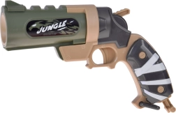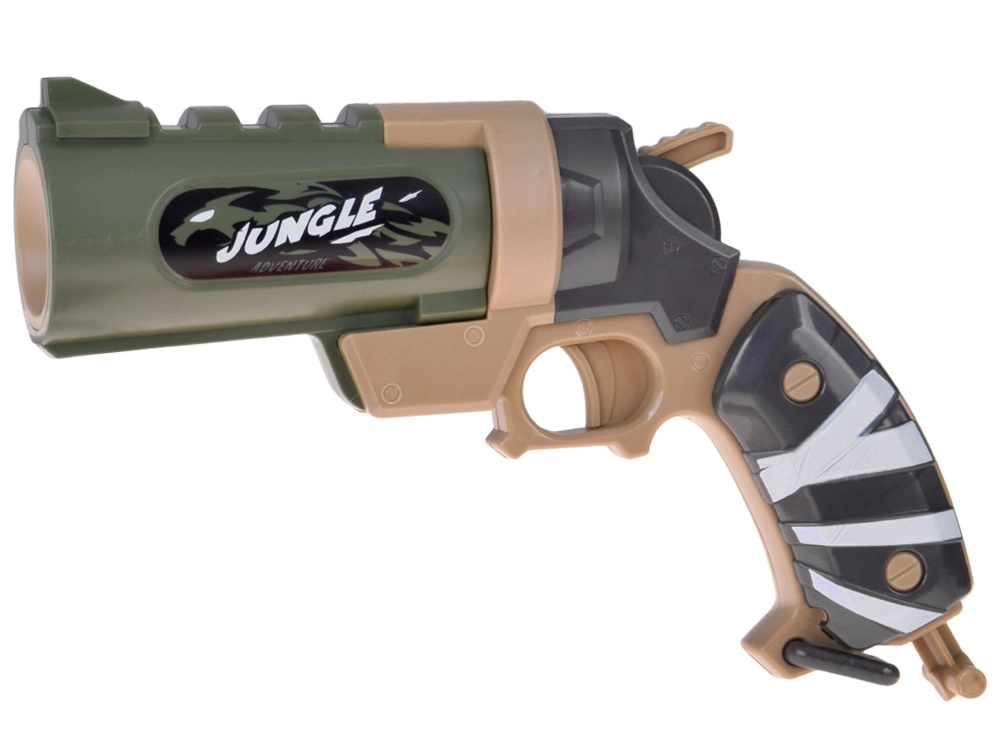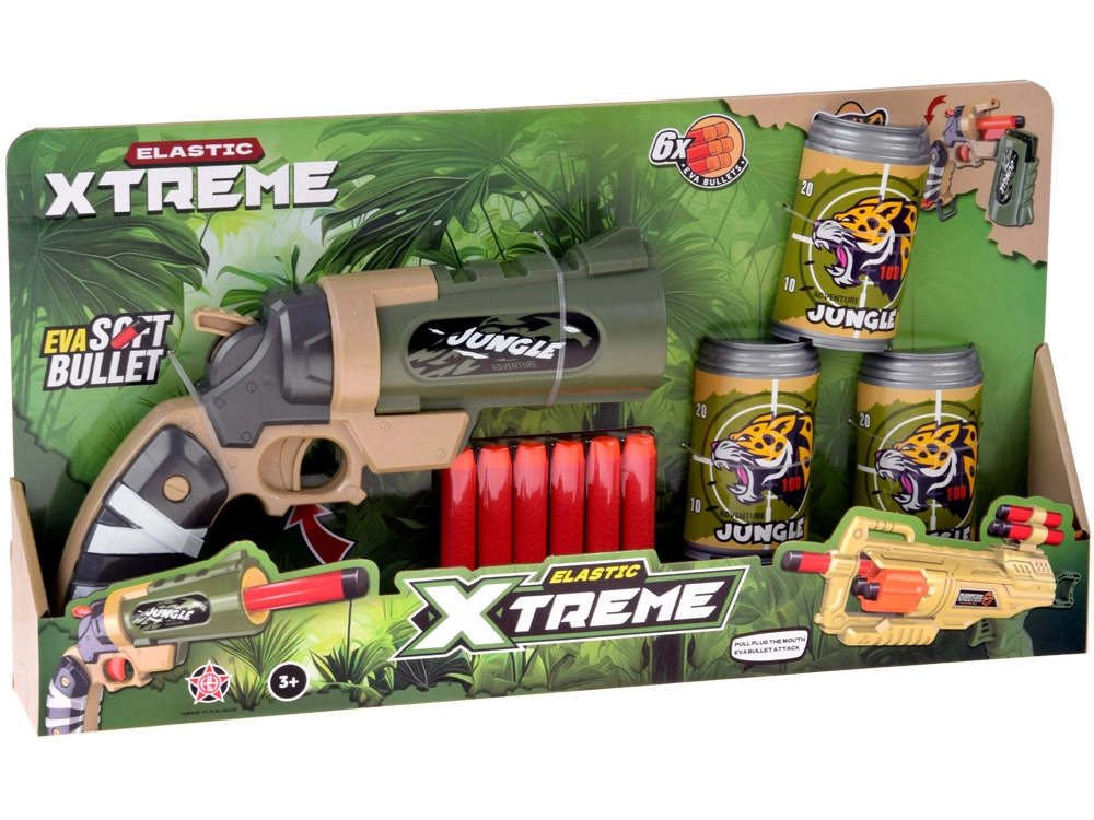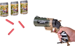- 1× pistole JUNGLE, 6× pěnový náboj (gumová špička), 3× plastový terč – plechovka
