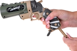 Set JUNGLE je skvělou volbou pro akční hry venku i uvnitř. Lehká a odolná pistole se pohodlně drží v dětské ruce, střely z měkké pěny s gumovou koncovkou zajišťují bezpečnější hru a terče ve tvaru plechovek motivují k tréninku přesnosti. Stačí nabít, zamířit a sestřelit cíle.