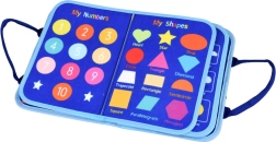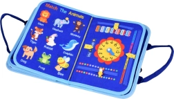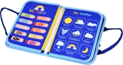 Abeceda, čísla 1–10, tvary, barvy, počasí, zvířátka, kalendář a hodiny i suchostíratelná tabulka – vše v jedné přenosné knížce.