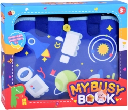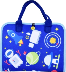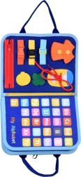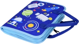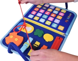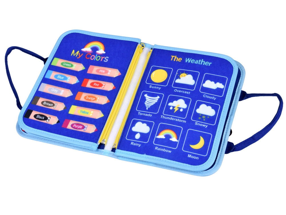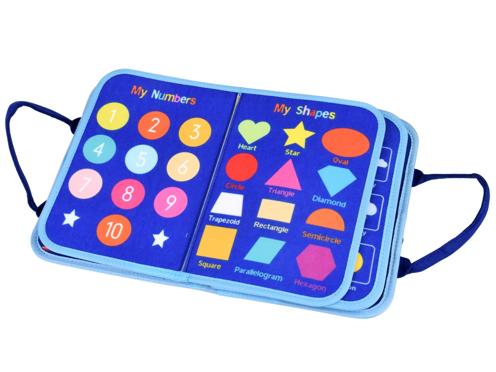 Přenosná textilní aktivní knížka pro děti s 10 interaktivními stránkami rozvíjí jemnou motoriku, logiku a kreativitu. Obsahuje aktivity jako abeceda, čísla 1–10, tvary, barvy, počasí, zvířátka, kalendář a hodiny i suchostíratelnou tabulku s fixy. Měkké materiály, zip a ucha zajišťují bezpečnou a snadnou manipulaci doma i na cestách.