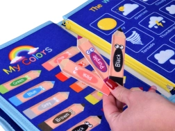 Tato senzorická knížka ve formě zipové tašky s uchy ukrývá 10 barevných stran s odnímatelnými filcovými dílky na suchý zip. Děti si při zapínání zipů a přezek, zavazování tkaniček, třídění tvarů či přiřazování písmen a čísel procvičí jemnou motoriku, oko‑ruka koordinaci i samostatnost. Knížka je v angličtině, ideální pro první seznamování s anglickými slovíčky.
