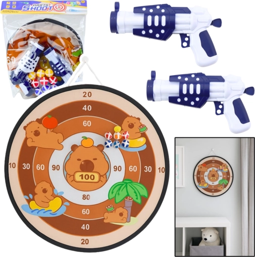 Velkoformátový terč s atraktivním potiskem kapybar se snadno zavěsí na zeď pomocí háčku s přísavkou. Dvě pistolky v balení umožní férové souboje jeden na jednoho – skvělé pro rodiny i dětské návštěvy. Hra nevyžaduje baterie, takže je vždy připravena k akci.