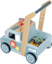 Toto chytré chodítko ve tvaru modrého náklaďáku je ideální pomocník pro první krůčky a současně zábavná STEM dílna. Robustní dřevěná konstrukce poskytuje stabilitu, zatímco otáčecí ozubená kola, převody a montážní desky zvou k objevování principů mechaniky a rozvoji koordinace.